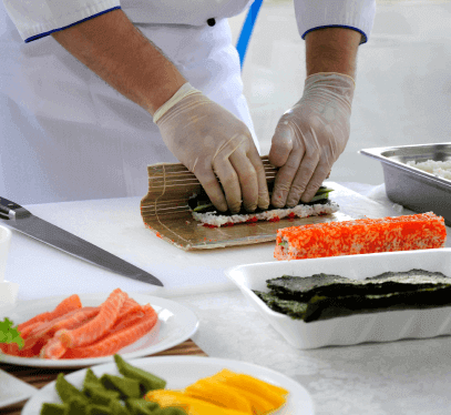 Cream cheese, avocado, cucumber, salmon, sushi rice, nori, pickled ginger, wasabi