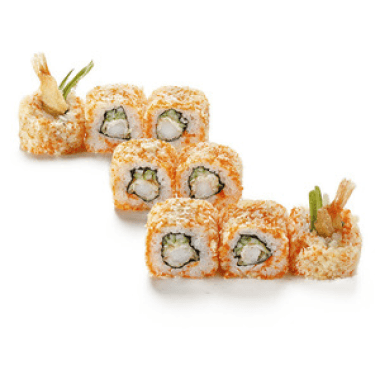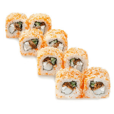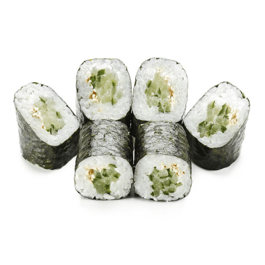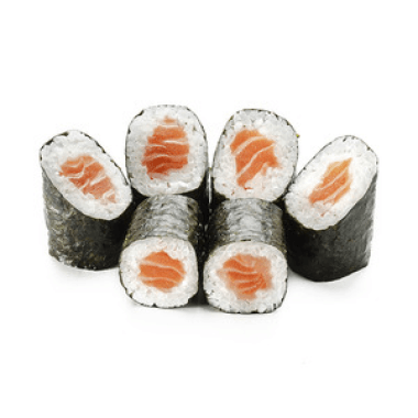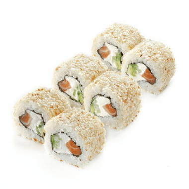 Cream cheese, avocado, cucumber, salmon, sushi rice, nori, pickled ginger, wasabi